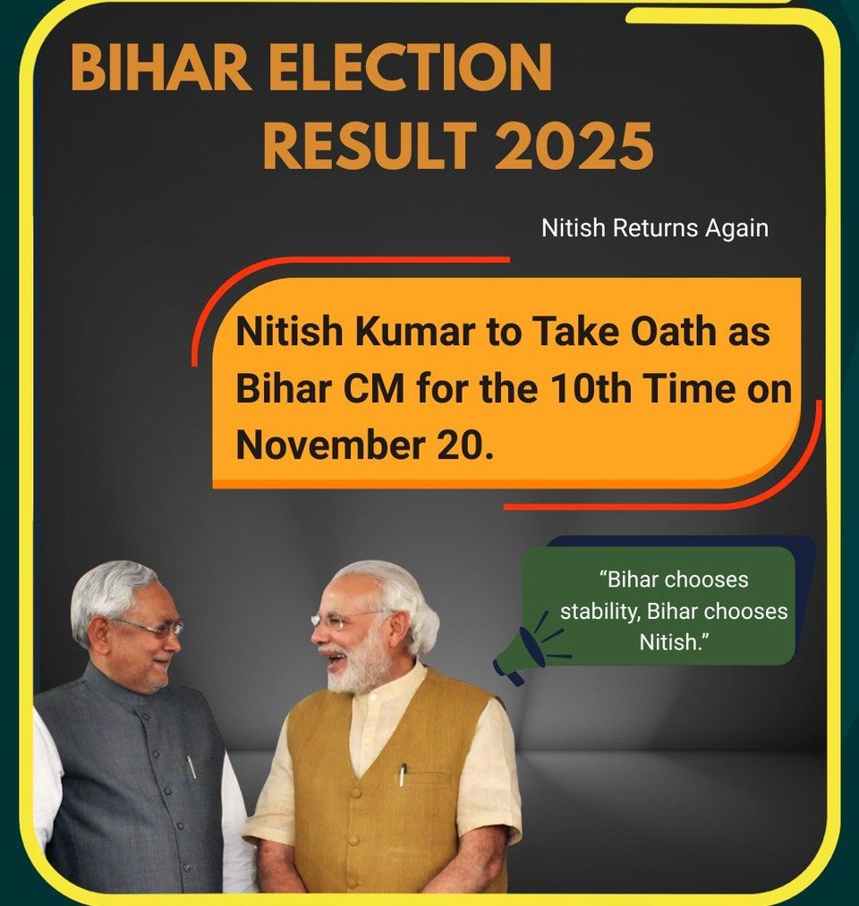 PoliticsNitish Kumar to be elected NDA leader in Bihar; set to take oath as CM on Nov 20! Riya Mehra / November 19, 2025