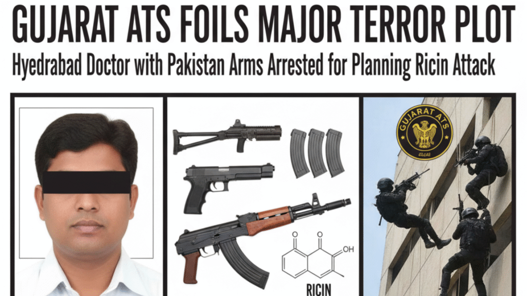 LocalHyderabad Doctor with Pakistan Arms Arrested for Planning Ricin Attack: Gujarat ATS Knocks Out Major Terror Plot Riya Mehra / November 10, 2025
