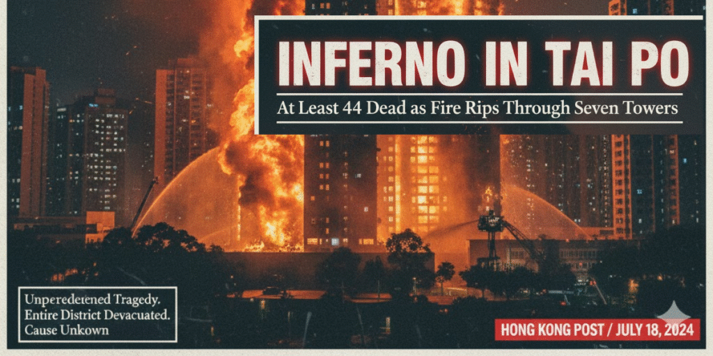 The fire swept multiple towers of Wang Fuk Court, a large public-residential estate in the Tai Po district of Hong Kong’s New Territories.