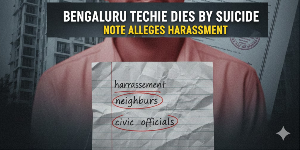 - He left a note accusing a neighbouring couple and officials from the Greater Bengaluru Authority (GBA/BBMP) of harassment, extortion and mental torture.